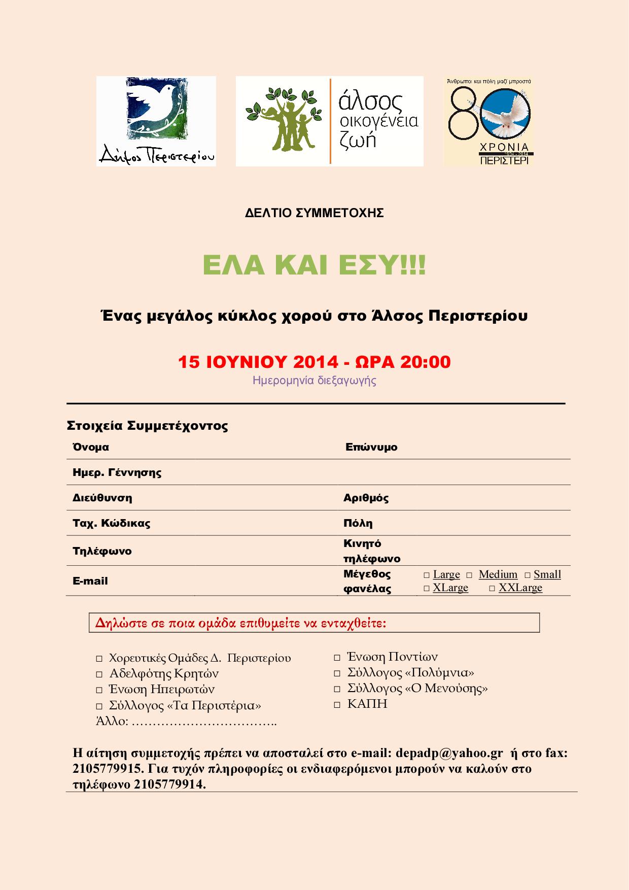 Οι πολίτες μπορούν να δηλώσουν τη συμμετοχή τους συμπληρώνοντας τη σχετική αίτηση, την οποία μπορούν να βρουν στο διαδίκτυο (peristeri.gr, facebook.com/DimosPeristeriou και twitter.com/Dim_Peristeriou), στα τοπικά ΜΜΕ, στους εθνικοτοπικούς συλλόγους, καθώς και στις δημοτικές υπηρεσίες (Δημαρχιακό Μέγαρο, ΔΕΠΑΔΠ, Δημοτικά Εργαστήρια, Δημοτική Βιβλιοθήκη - Πανεπιστήμιο, Άλσος). Η αίτηση συμμετοχής πρέπει να αποσταλεί στο e-mail: depadp@yahoo.gr ή στο fax: 2105779915. Για τυχόν πληροφορίες οι ενδιαφερόμενοι μπορούν να καλούν στο τηλέφωνο 2105779914.